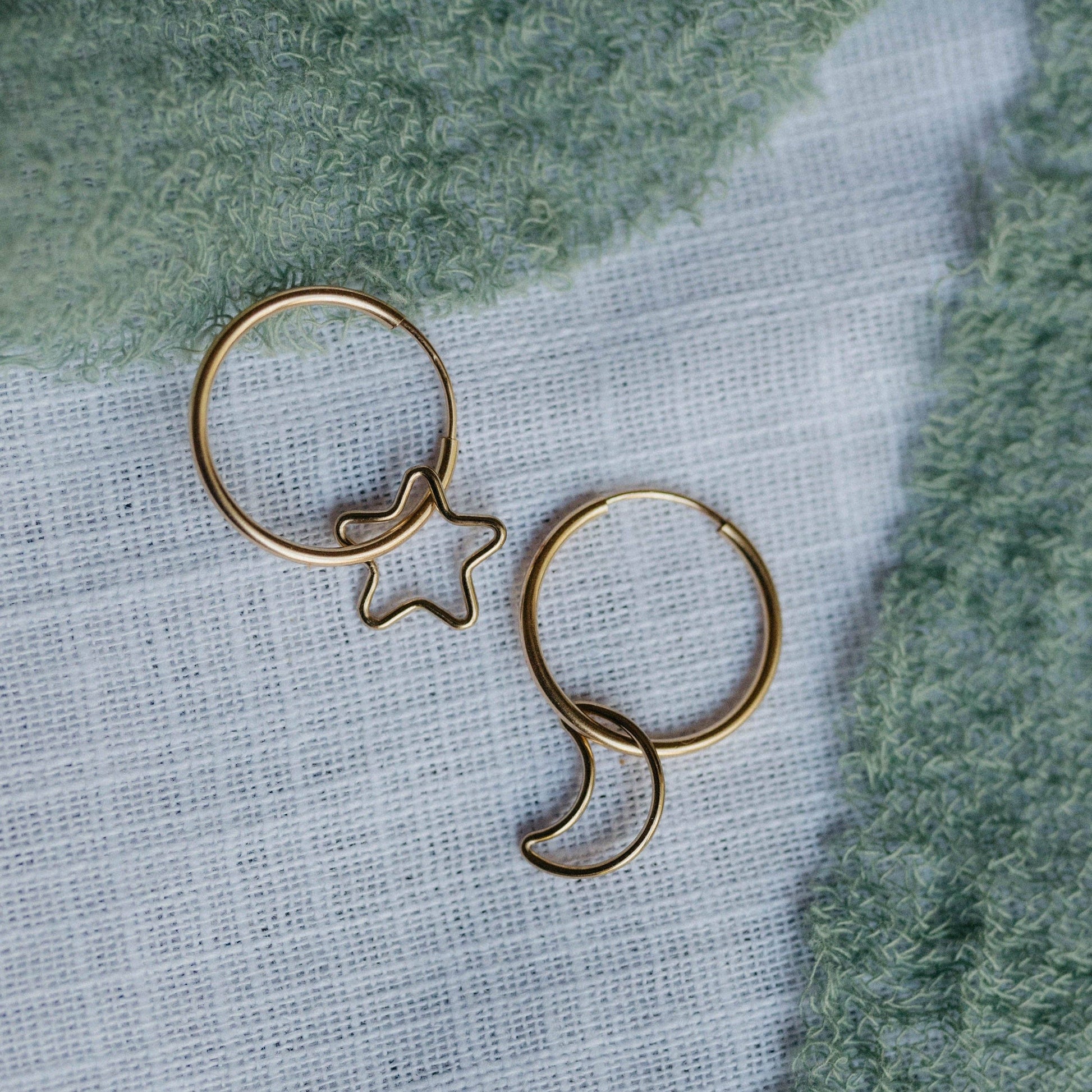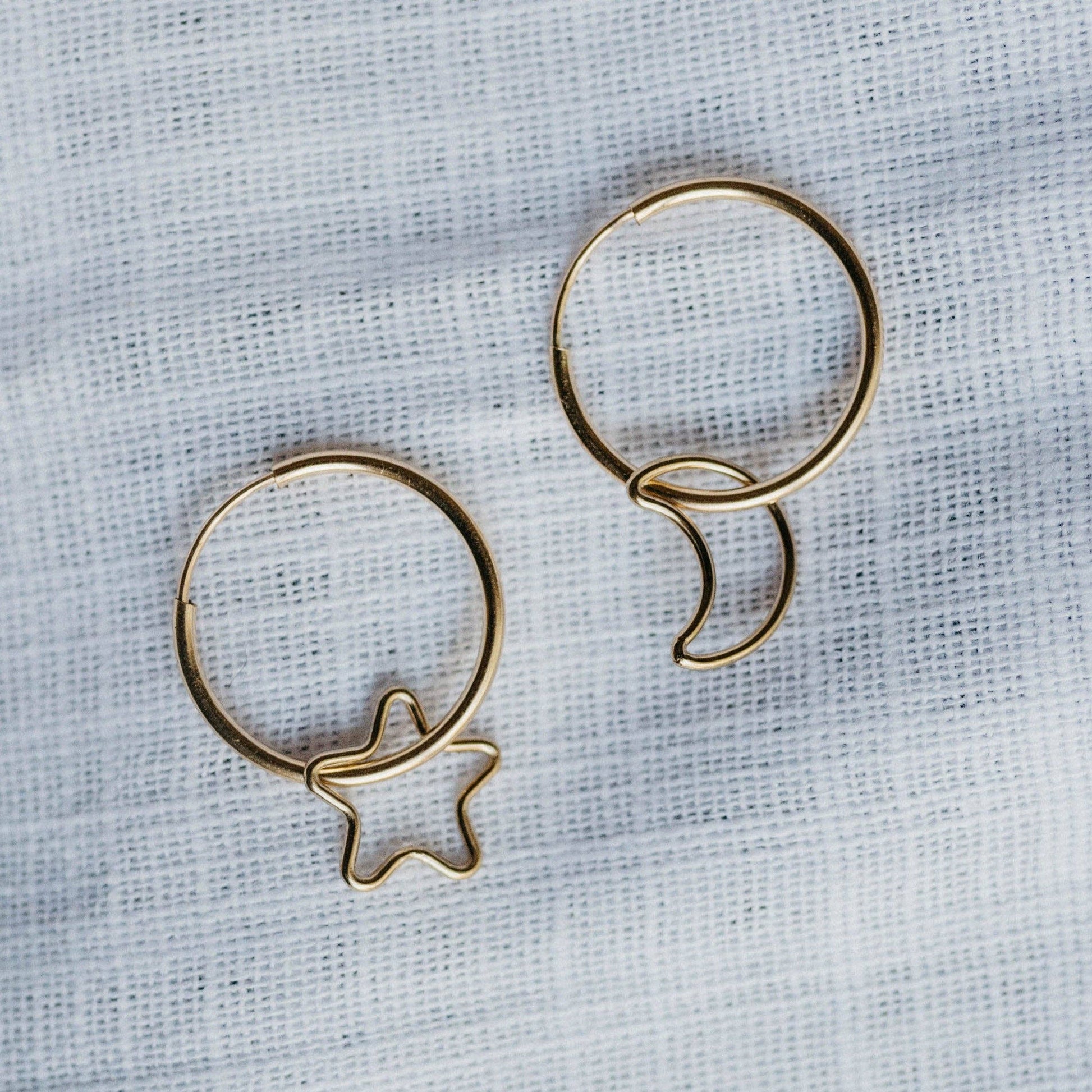 How to wear: Gently pull post out of hoop and twist ends away from each other. Slip the hoop opening between ear lobe with the post in the front of your piercing. Insert post into piercing and gently twist ends back together to place post back into the hoop. Avoid pulling hoops open and instead twist the ends away from each other to maintain the shape of the hoop. - Available in 14k gold filled or sterling silver - 16mm hoop with 9x12mm crescent moon charm and 10.5mm star charm